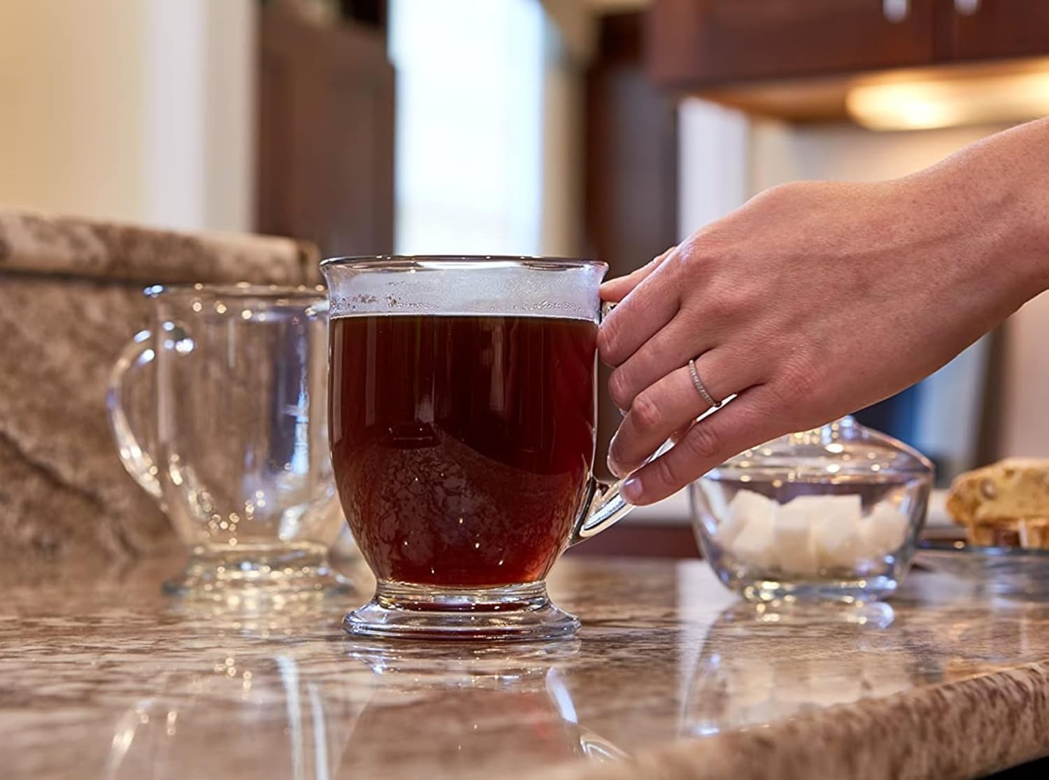 Set of 6 clear 16-oz glass coffee mugs with oversized handles, ideal for hot drinks. Durable, weighted design helps prevent spills and suits any setting. Made from safe, non-reactive glass that won’t stain, warp, or retain odors. Perfect for coffee, tea, and gifting for weddings, holidays, or birthdays.